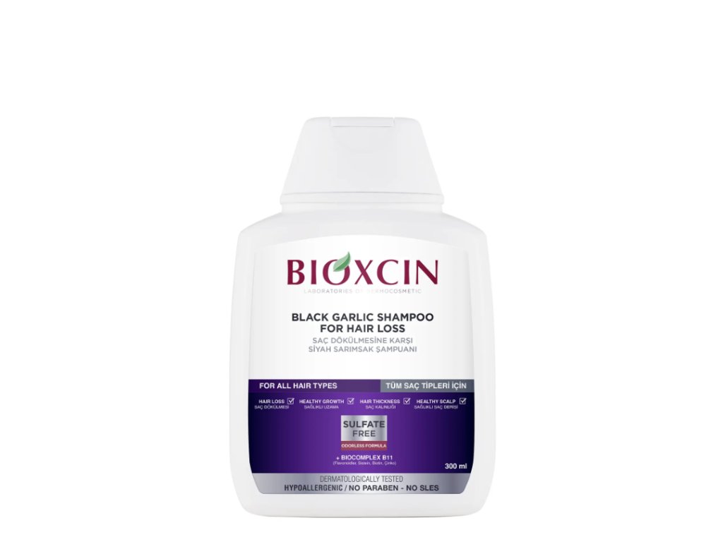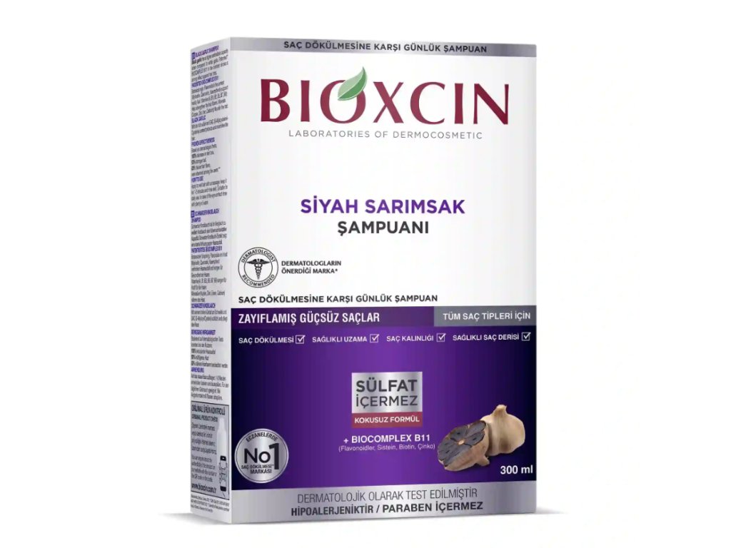 Šampon Bioxcin je inovativní produkt určený k ochraně, hloubkové výživě a potlačení vypadávání vlasů. Složení obsahuje extrakt z černého česneku, extrakt z břečťanu obecného, bioaktivní keratinové peptidy a patentovaný bylinný komplex BioComplex B11.