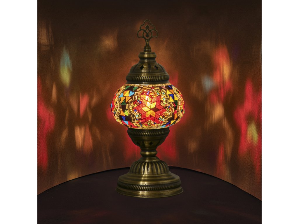 Orientální stolní lampička s barevnou mozaikou. Lampička je ruční výroby, proto se barevnost a poskládání mozaiky může lehce lišit od fotografie, získáte tak ale 100% originál, který byl vyroben jen pro vás.