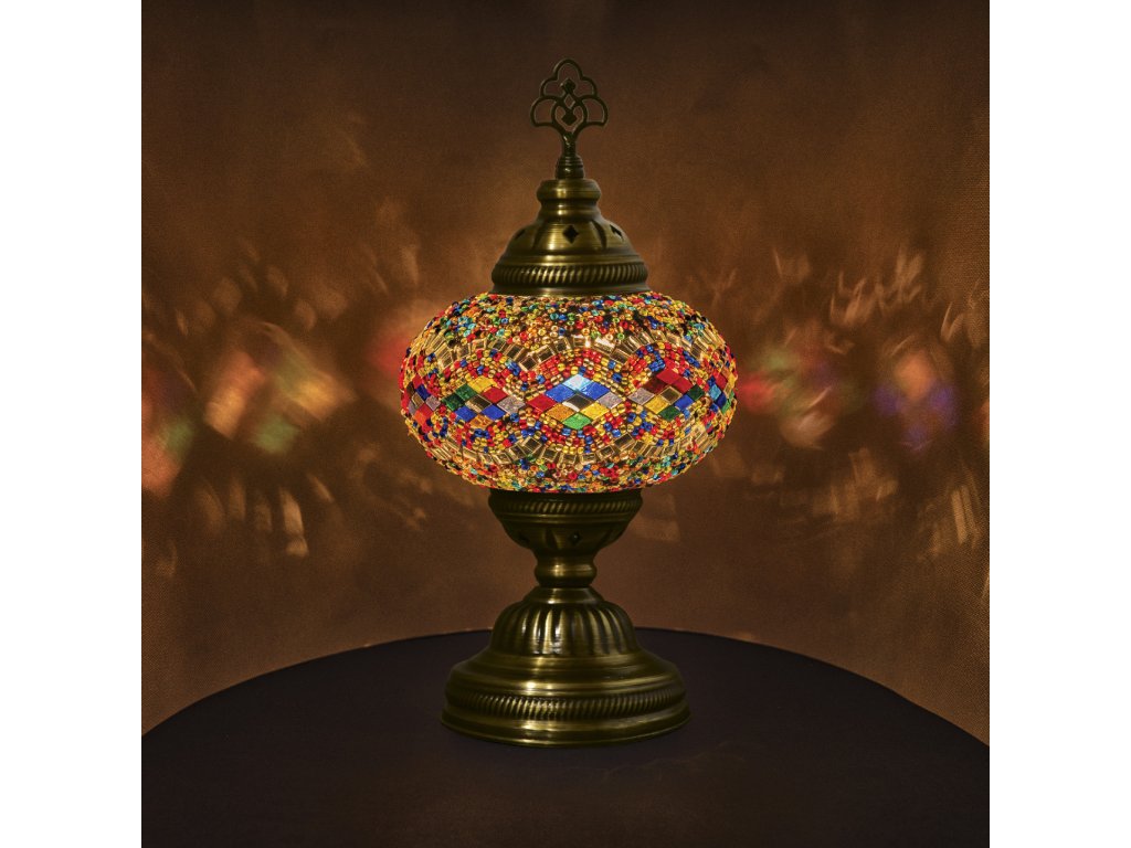Orientální stolní lampička s barevnou mozaikou. Lampička je ruční výroby, proto se barevnost a poskládání mozaiky může lehce lišit od fotografie, získáte tak ale 100% originál, který byl vyroben jen pro vás.