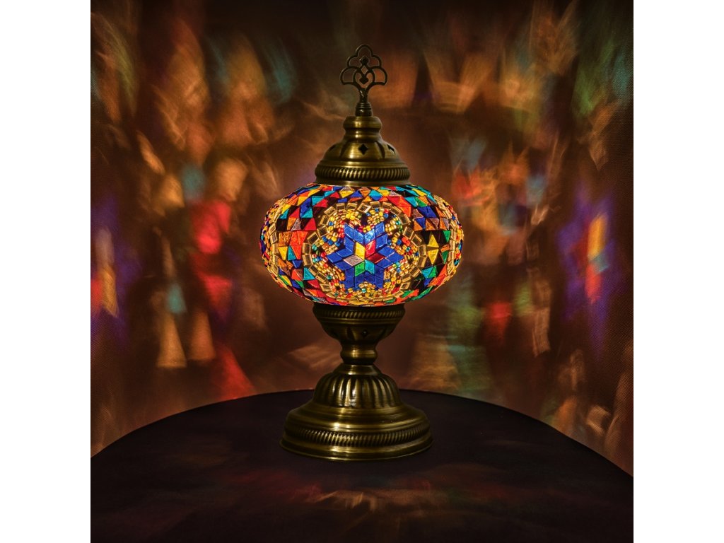 Orientální stolní lampička s barevnou mozaikou. Lampička je ruční výroby, proto se barevnost a poskládání mozaiky může lehce lišit od fotografie, získáte tak ale 100% originál, který byl vyroben jen pro vás.
