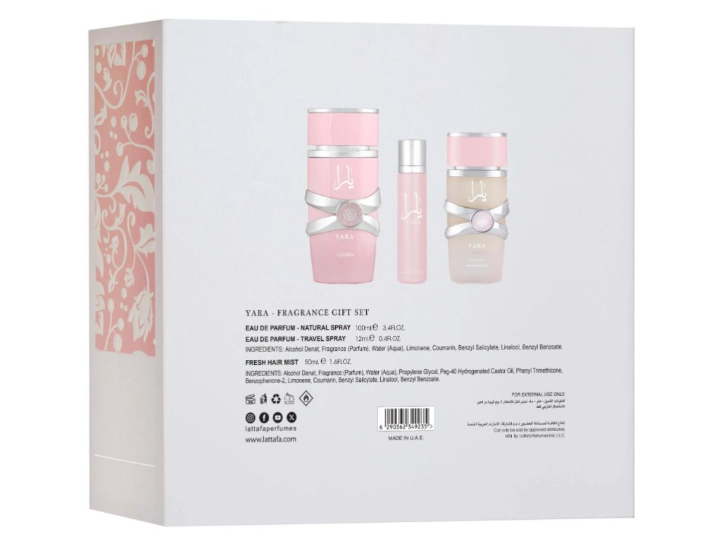 Lattafa Dárkový set Yara - Parfém 100ml + Olejový parfém 12ml + Vlasový sprej 50ml