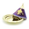 Dekorace marockého tajinu ve výrazné fialové barvě se zlatými ornamenty. Tajin je kovový a poklice je potažená látkou. Tažín je ruční výroby.