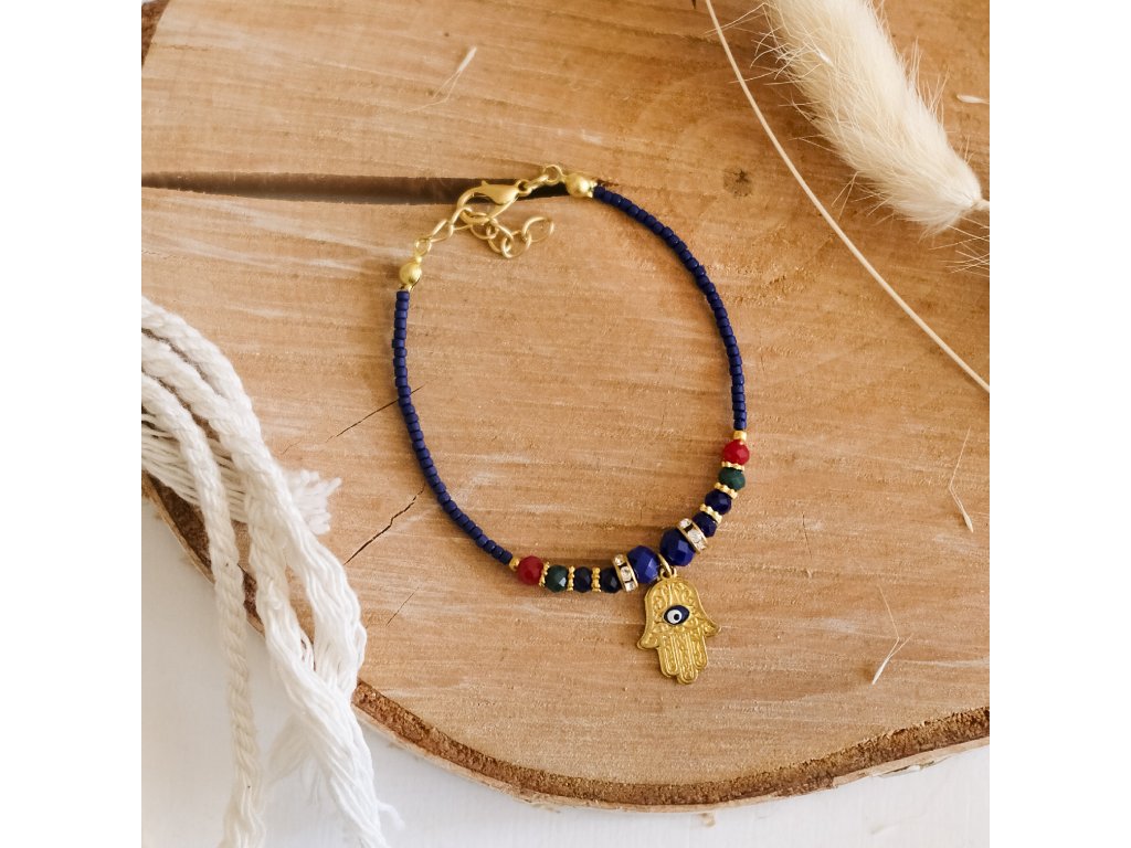 Elegantní korálkový náramek v tmavě modré barvě s přívěskem Hamsy (Ruka Fatimy) a symbolem Evil Eye neboli Nazar. Nazar je ochranný talisman ve tvaru modrobílého oka, které má ochraňovat majitele před zlým pohledem a uhranutím.