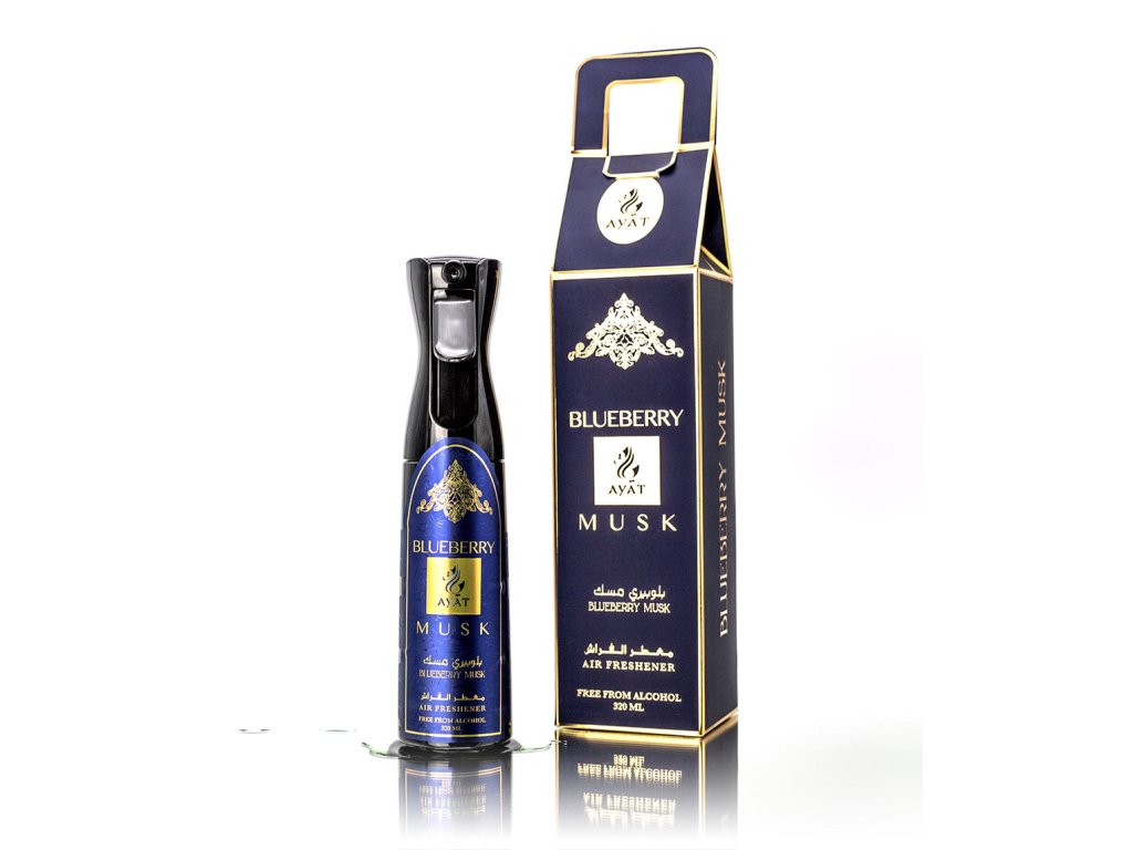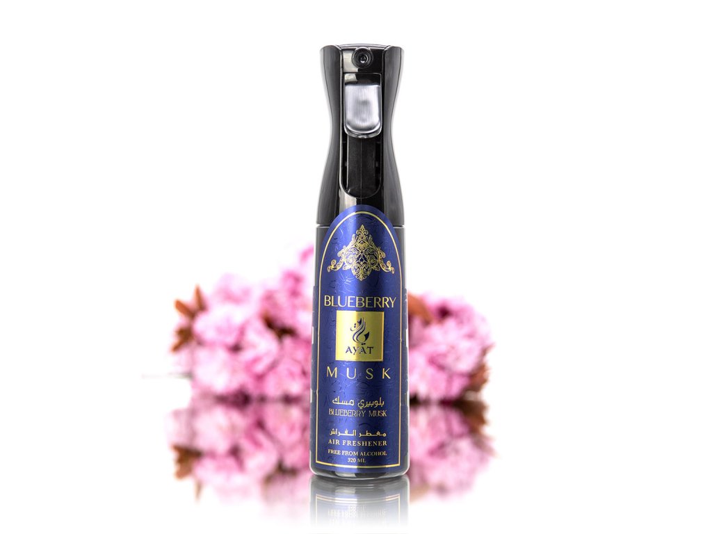 Osvěžovač vzduchu BLUEBERRY MUSK značky Ayat do interiéru, domu, do auta či na textil ve spreji. Osvěžovač odstraňuje nepříjemné pachy a osvěží vzduch v celém domě. Osvěžovač BLUEBERRY MUSK má sladkou ovocnou vůni, stejně jako parfémová voda BLUEBERRY MUSK která připomíná parfém Blueberry Musk od značky Abdul Samad Al Qurashi.