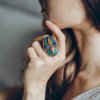 Boho prsten z Nepálu ruční výroby je vyroben z kovu a přírodních kamenů. Prsten je oválného tvaru a dominují mu kameny tyrkys, korál a lazurit.